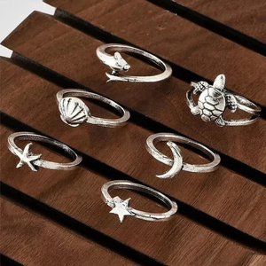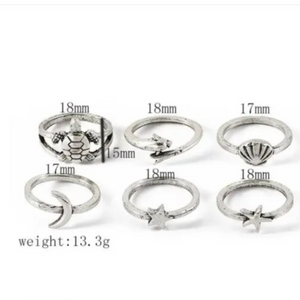 6pcs Silver Wide Kachua, Star, Moon Rings Set For Women Fashion