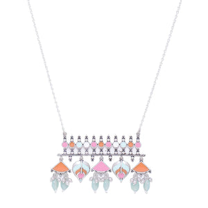 - Tribal-Inspired Statement Pendant: Featuring symmetrical fan, drop, and geometric motifs in soft orange, pink, and mint hues.