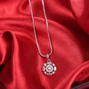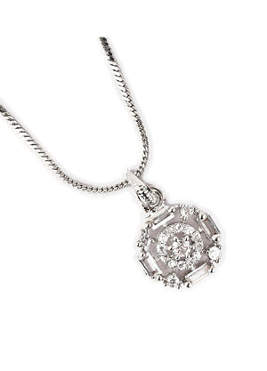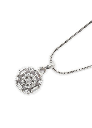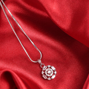 Add a touch of timeless elegance to your everyday style with the Celestial Radiance Pendant. Crafted with precision, this round-cut pendant features a beautiful mix of brilliant and baguette-cut cubic zirconia stones, set in a refined halo design. Its high-shine silver finish and graceful snake chain offer a look that's both modern and classic.