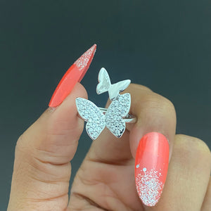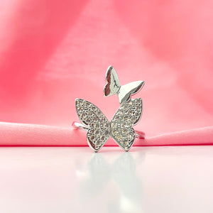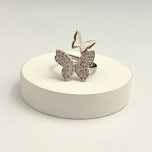Adjustable Silver Double Stone Studded Butterflies Ring