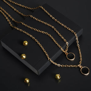 The Double Black Stone Golden Chain Pendant combines classic elegance with a contemporary edge. Its bold black stones paired with a sleek gold chain make this pendant a perfect piece for anyone who loves a little drama with their elegance. Whether you're wearing it on a night out or as part of your everyday ensemble, this pendant is sure to turn heads and enhance your overall style.