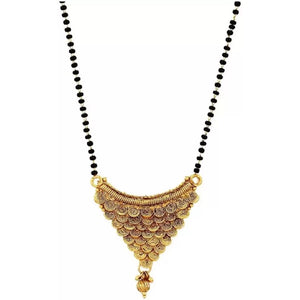 Gold-Plated Alloy: Made from high-quality gold-plated alloy, this mangalsutra offers both durability and a luxurious finish. The gold plating enhances the beauty of the pendant while ensuring it retains its shine over time. The addition of traditional black beads gives it the timeless appeal of a classic mangalsutra.
