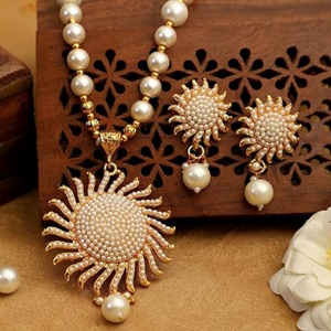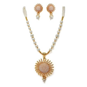 The necklace and earrings are expertly plated with a layer of high-quality gold, offering a rich, luxurious shine that complements the overall design. The gold finish is both durable and radiant, ensuring a lasting, polished look. -