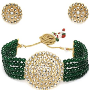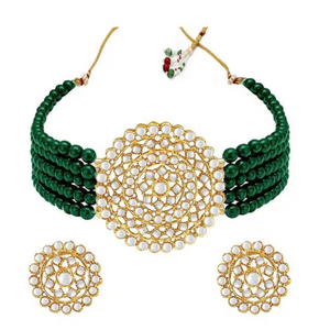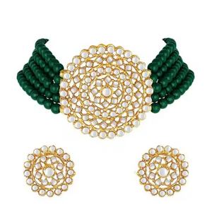 This choker set features fine Kundan work, a technique that originated in India and is known for its intricate and beautiful stone settings. The round pendant is crafted to perfection, with sparkling Kundan stones arranged to create a captivating focal point. These stones are set in a gold-plated base, which enhances their brilliance and creates a rich, luxurious look.