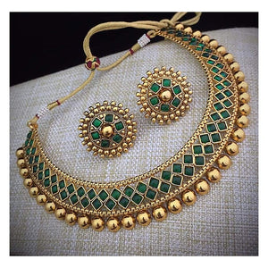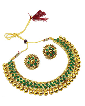 The necklace features a semi-crescent layout adorned with square-cut green stones set in a golden base, bordered by a row of lustrous gold balls. The earrings are styled in a circular sunburst design with green stonework and a prominent golden bead in the center — bringing a perfect blend of tradition and elegance.
