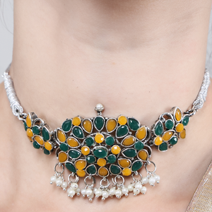 The Oxidized Yellow Green Beautiful Choker Necklace is crafted from high-quality oxidized silver, known for its durability and unique finish. The yellow and green stones are selected for their vibrancy and shine, providing a striking contrast against the oxidized base. The necklace is lightweight, making it comfortable for extended wear while maintaining its quality and shine over time. Whether worn for a special occasion or a casual outing, this necklace is sure to retain its charm and beauty for years to come.