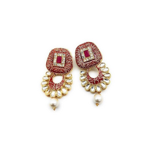 This necklace set is a masterpiece that highlights the fine art of Kundan craftsmanship. The centerpiece of the necklace features radiant American Diamonds carefully set in a beautiful pattern around the Kundan stones, giving the piece an enchanting glow. The necklace is further enhanced by the rich, red pearls that drape beautifully around the neck, offering a classic yet striking look.
