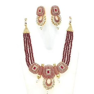 Red Pearl Necklace Set Studded with American Diamond & Kundan with Earrings