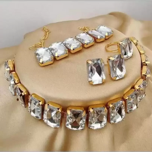 Introducing the exquisite White Crystal Jewelry Set, a perfect blend of elegance and radiance. This beautiful set, consisting of a bracelet, earrings, and necklace, is designed to add a touch of sophistication and sparkle to any occasion. Whether you're dressing up for a special event or adding a refined touch to your everyday wear, this set is sure to impress.